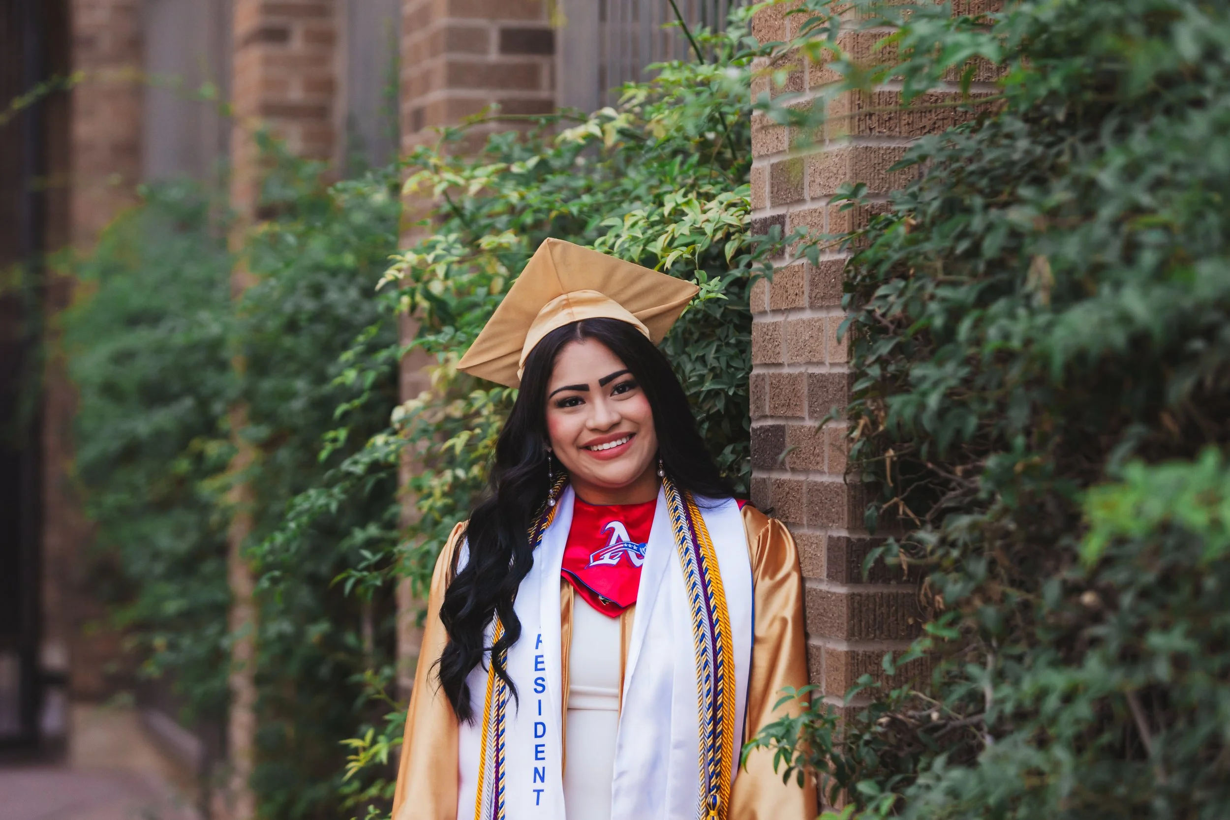High School Senior girl dressed in white with gold graduation cap and gown standing against brick and ivy.