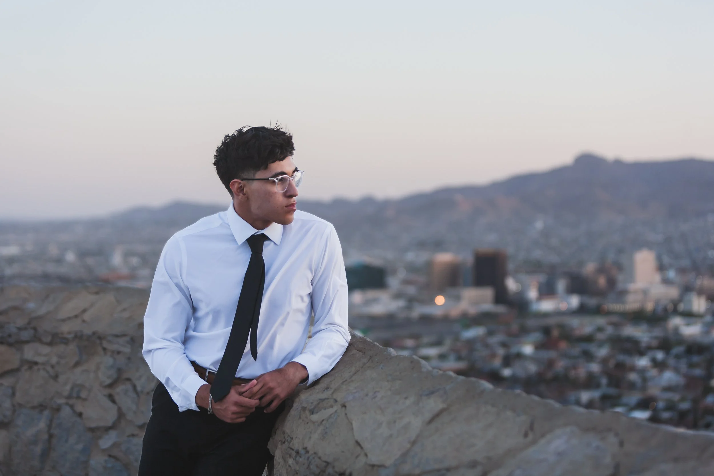 High school senior boy wearing black dress pants, white dress shirt with a black tie leaning against a rock wall peering into the distance with downtown El Paso in the background.