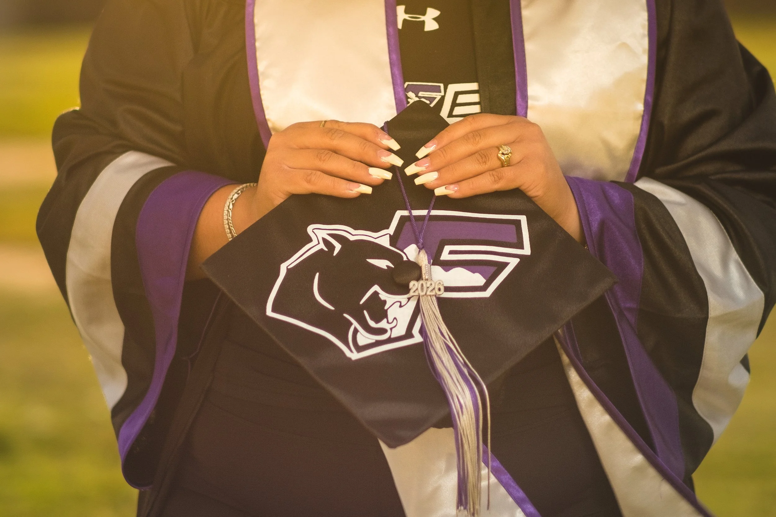 Franklin High School (El Paso, TX) Senior girl holding her cap in her hands with the 2026 tassel hanging over edge