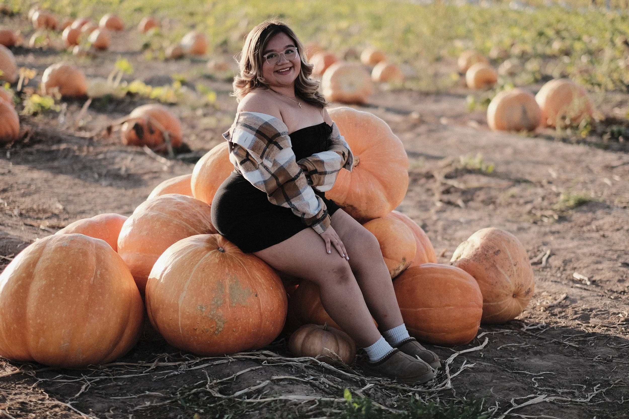 High School Senior Girl (Franklin HS - El Paso, TX) sitting on pile of pumpkins in black dress and brown jacket.