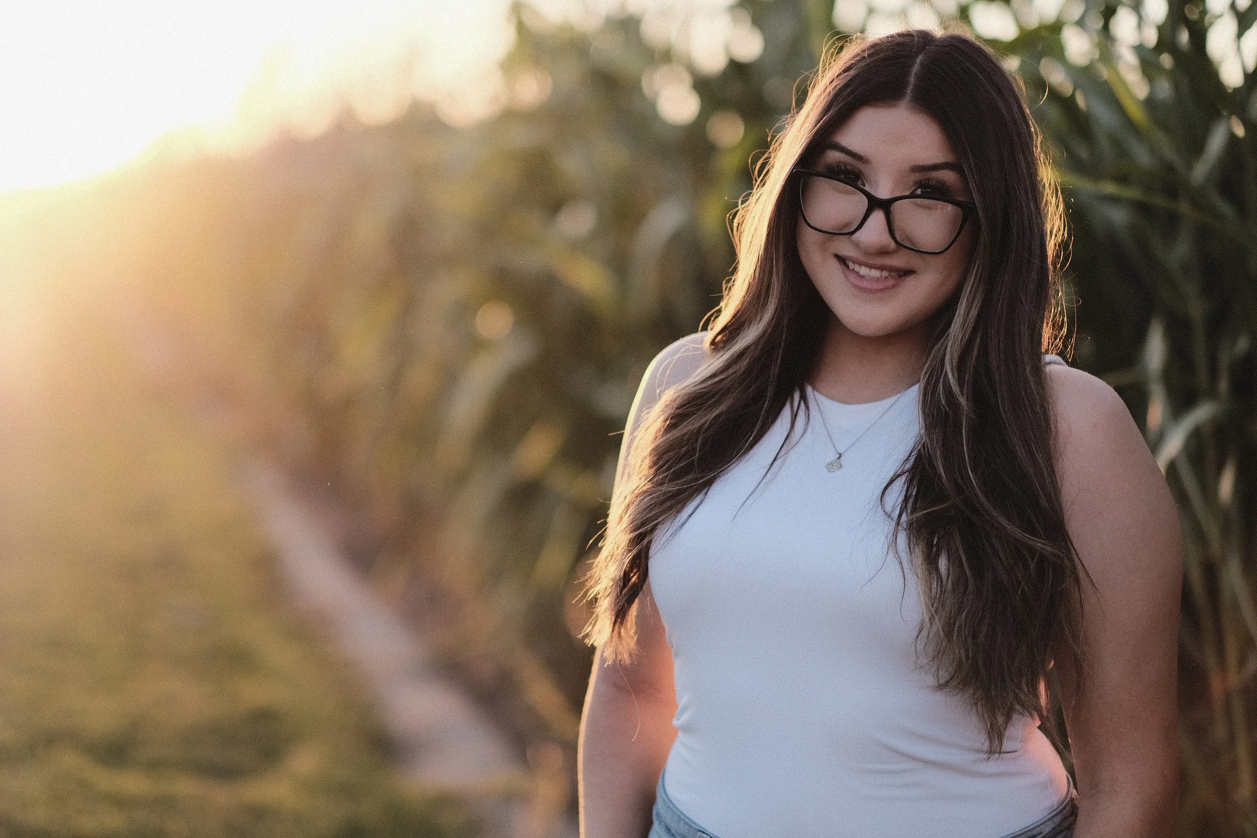 High School Senior Girl (Eastlake HS - El Paso, TX) standing in front of corn maze at sunset wearing white top and jeans.